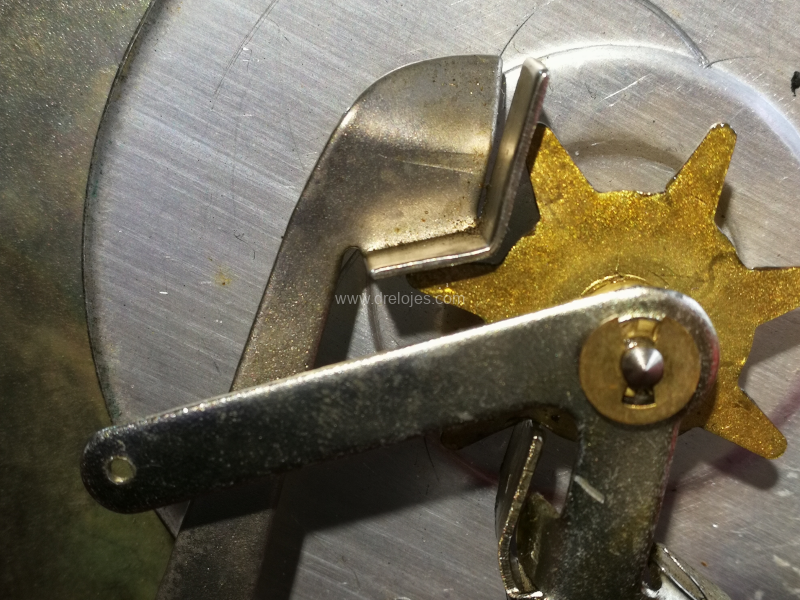 El mecanismo del reloj sube y baja una palanca que produce el avance de la rueda de los días de la semana. Conectada con esta palanca, una varilla transmite la fuerza a la rueda de los días del mes.