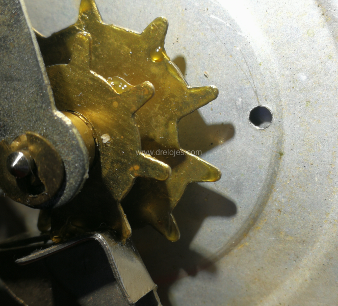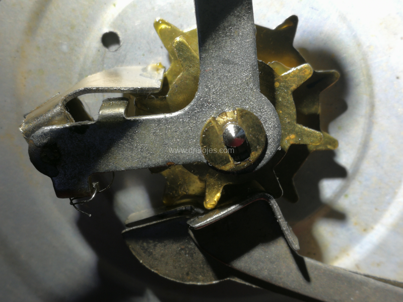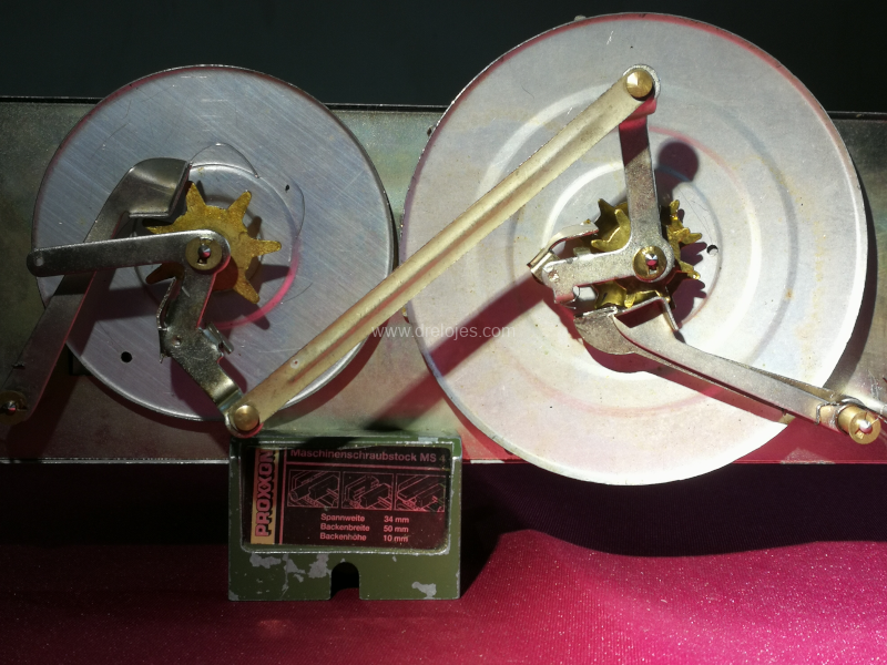 En la imagen anterior vemos el mecanismo del calendario con los discos en los que se indican los días de la semana y del mes. Estos últimos, se componen mediante dos discos.